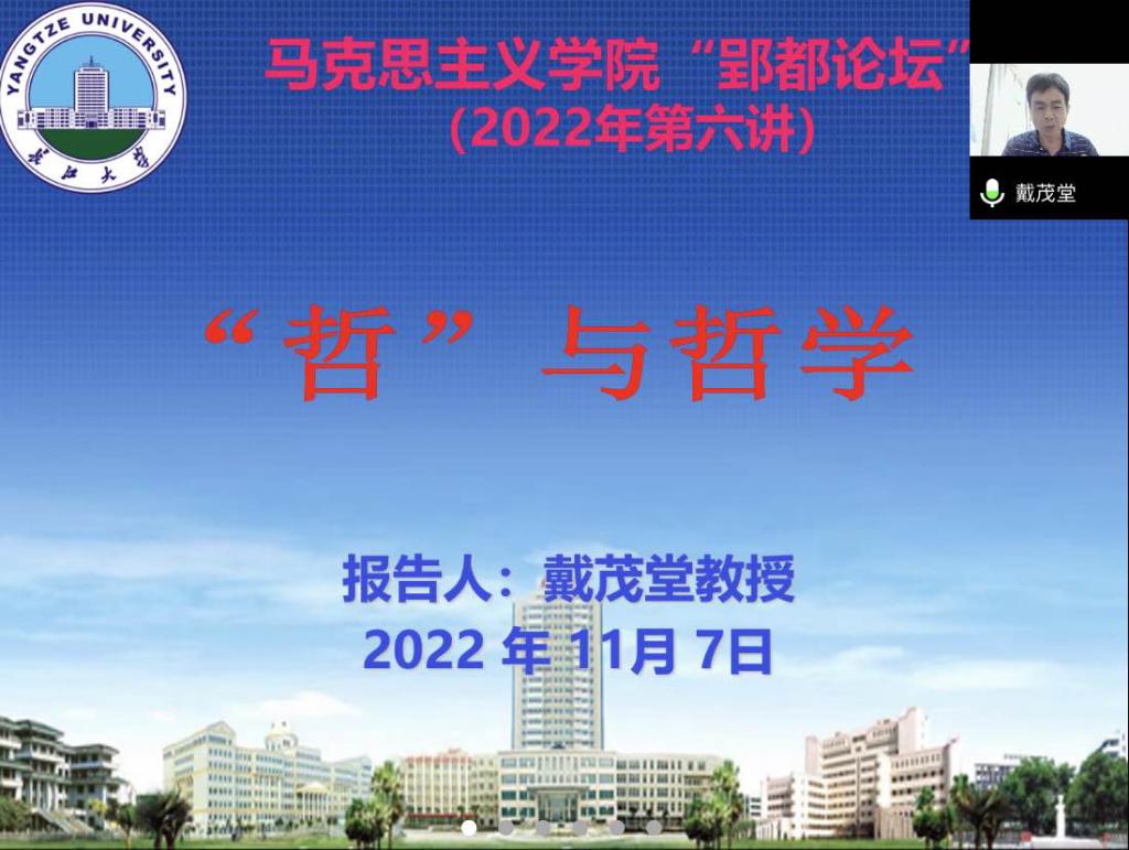 (通讯员:田语萱 谢蕾)2022年11月7日上午9:00-12:00,3044永利“郢都论坛”2022年第六讲,在文科楼1104会议室和腾讯会议以线上线下相结合的方式同步举行。本次讲座的主讲嘉宾为北京师范大学哲学国际中心的戴茂堂教授,他以“‘哲’与哲学”为主题,深入浅出地解析了哲学的意涵,还原了哲学最本真的内容。讲座由学院副院长涂江波老师主持,学院100多位师生参与聆听。