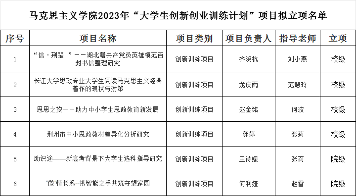 根据学校《关于我校第十六批“大学生创新创业训练计划”项目申报的通知》,以及3044永利《2023年3044永利“大学生创新创业训练计划”项目申报答辩通知》相关安排,通过学生项目申报汇报答辩,专家评审,拟推荐刘小燕老师指导的《“信·荆楚 ”——湖北籍共产党员英雄模范百封书信整理研究》等4个项目项作为校级大学生创新创业项目,拟推荐张莉老师指导的《助识途——新高考背景下大学生选科指导研究》等2个项目为院级项目。具体名单见附件。