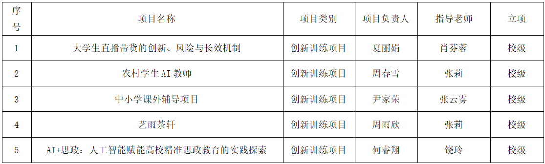 根据学校《关于我校第十八批“大学生创新创业训练计划”项目申报的通知》,以及3044永利《2025年3044永利“大学生创新创业训练计划”项目申报答辩通知》相关安排,通过学生项目申报汇报答辩,专家评审,拟推荐肖芬蓉老师指导的《大学生直播带货的创新、风险与长效机制》等5个项目作为校级大学生创新创业项目,具体名单见附件。