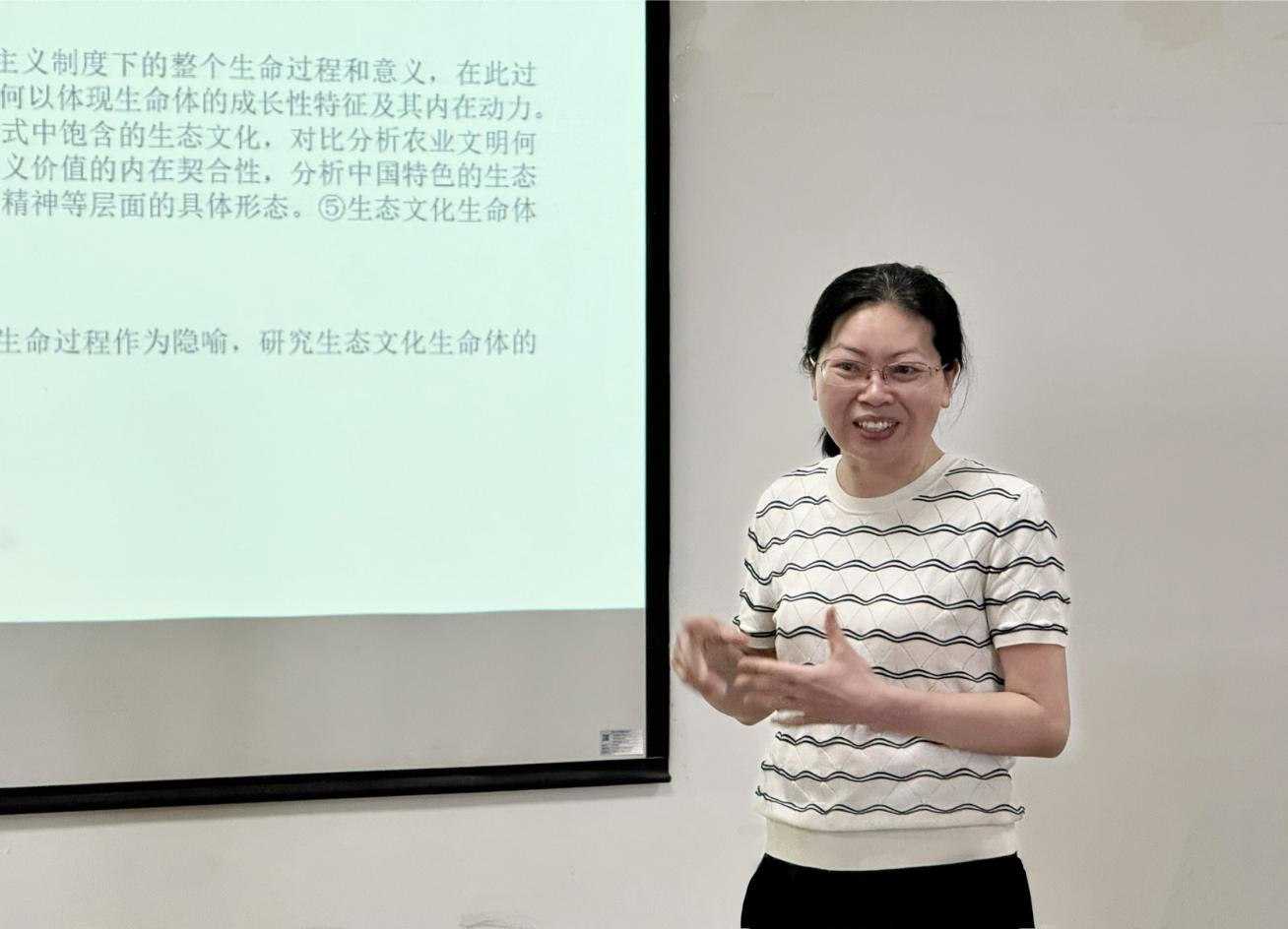 “生态文化是‘新的文化生命体’中最具生命力的组成部分,中国特色的生态文化生命体的构造、过程、规律和价值是非常值得研究的”。通过对习近平总书记提出的“新的文化生命体”概念的深度解读,黄晓云副教授从生态维度切入,强调“山水林田湖草沙是生命共同体”理念为文化生命体注入了深层生态根基。她提出,中国特色的生态文化生命体不仅体现于物质层面的生态系统保护,更蕴含在文化价值观对于生态伦理的塑造之中。在讲到民族文化传承与共同体意识培育时,黄晓云以生态文化模因为线索,梳理了其在中华民族交流交融中的传播路径。她指出,深化生态文化模因研究有助于从文化根源上铸牢中华民族共同体意识,并为铸牢中华民族共同体意识提供生态文化支撑。
