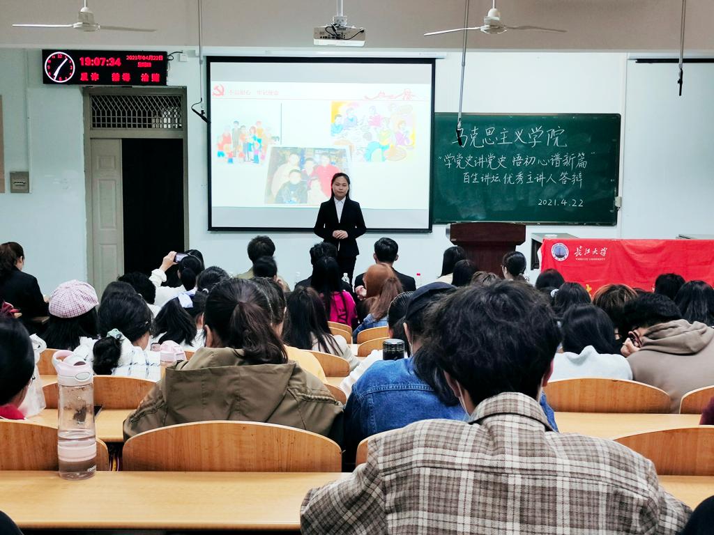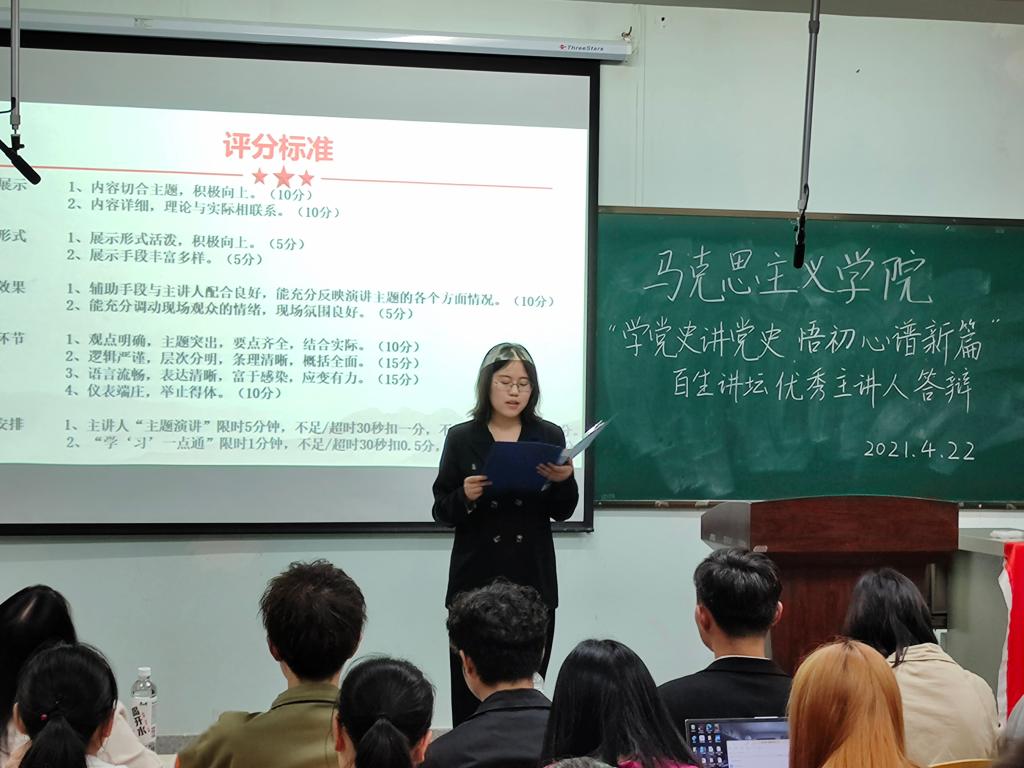 (通讯员 李春燕)学党史讲党史,悟初心谱新篇。 4月22日19:00,3044永利“百生讲坛”优秀主讲人答辩活动于13教A203举行。本次活动邀请辅导员李敏、团委学生会主席李懿宸、副主席魏文婵、莫保华和部分部长作为嘉宾评委。大一大二全体同学参加。