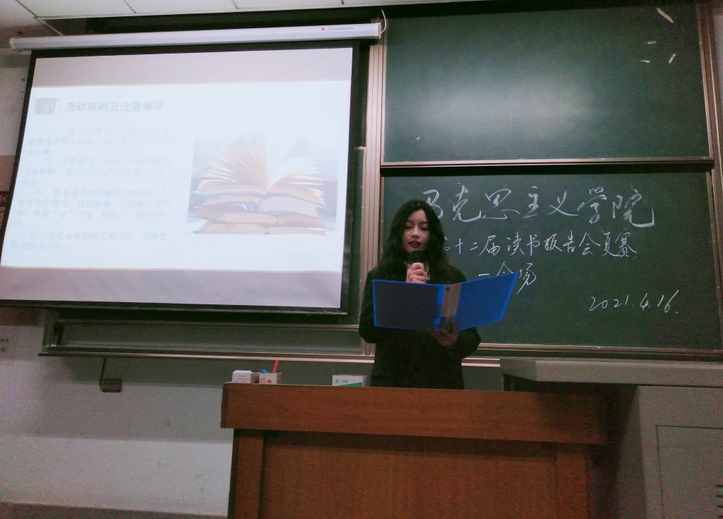 在主持人欢迎嘉宾之后为我们介绍了复赛规则:参赛选手依次采取现场限时评述结合的形式进行报告,评委按十分制现场打分,本次比赛取每个会场前6名进入决赛,结果由赛后工作人员短信通知。来自12个学院的参赛选手们,昂首挺胸、意气风发,对参赛选书的作者、内容、地位意义和感受侃侃而谈。现场观众津津乐道,掌声不断。