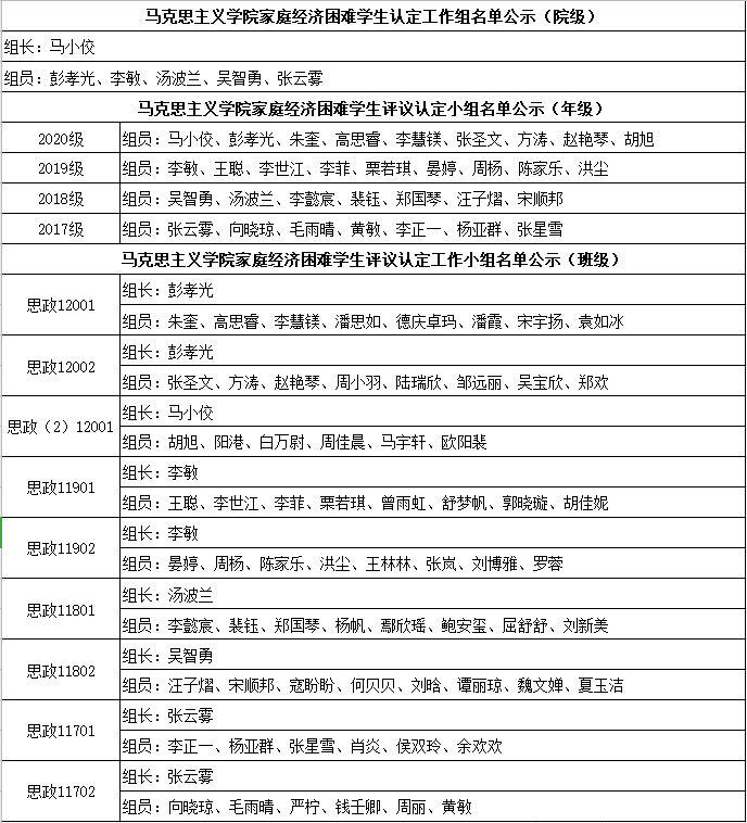 根据长江大学《关于做好2020-2021学年家庭经济困难学生认定工作的通知》,结合学院实际,现将我院2020-2021学年家庭经济困难学生认定评议工作组成员名单公示如下: