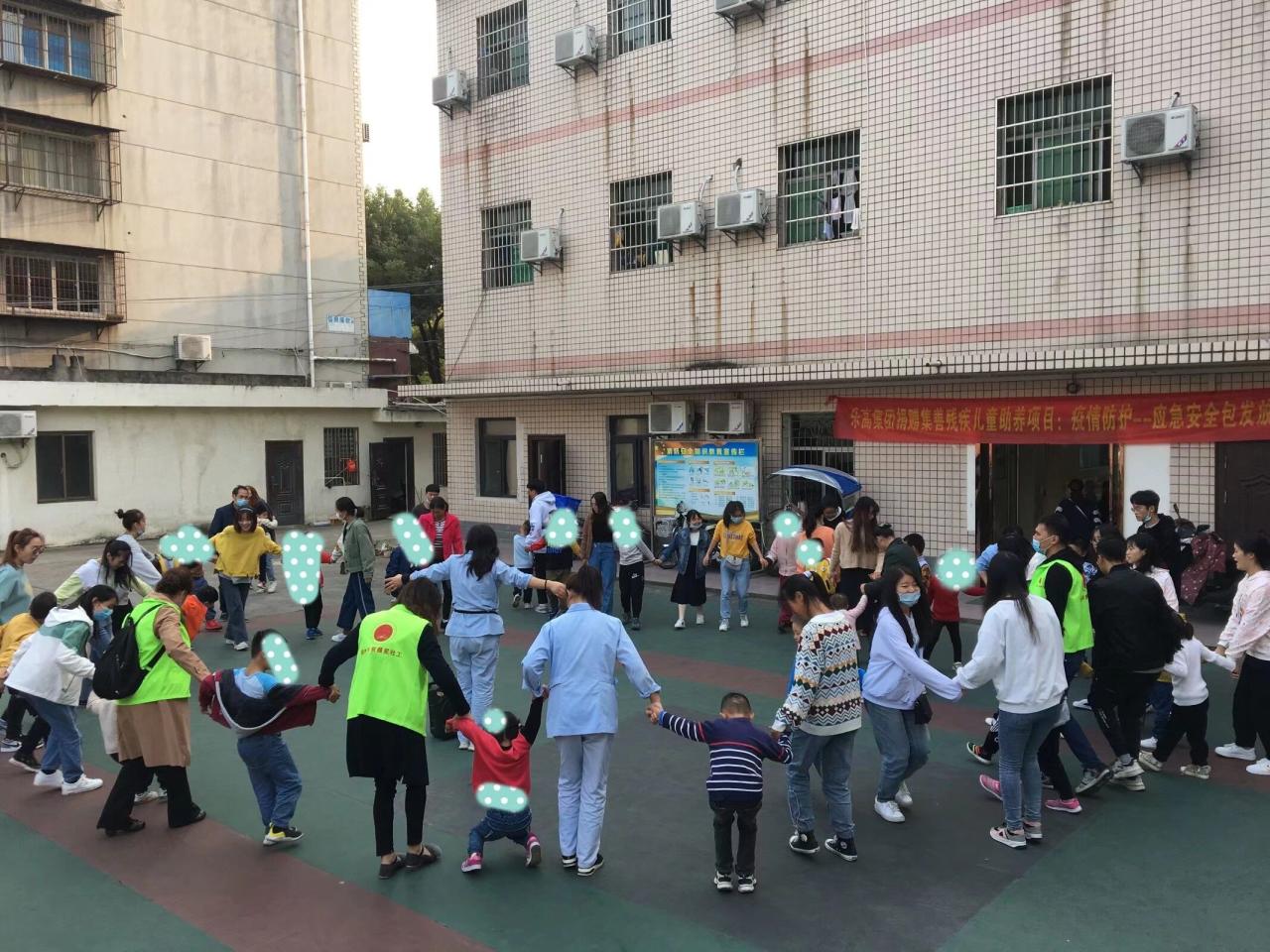 随后,我们以4—11人的分组陪同不同班级的孩子进行学习与玩耍,志愿者们耐心守护,寸步不离。我们将带来的水果和饼干分享给每一位小朋友,并通过搭积木、拼图形、擦鼻涕、举高高、牵手手等各种方式与小朋友们拉近了距离,走进了小朋友的心里。在进行完教室活动后,我们与全体小朋友在操场进行围圈跑活动,围的圈时大时小,目的就是为了锻炼小朋友的肢体协调以及对指令接收意识的能力。