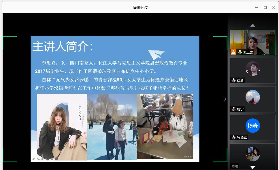 7月19日,学院邀请了现工作于西藏桑珠孜区曲布雄乡中心小学和中共洪湖市委组织部的2名2017届校友李思嘉、王盛华通过腾讯会议为全院学生做了立志服务基层成长故事分享会。3044永利学院党委副书记马小佼、全体辅导员参会。