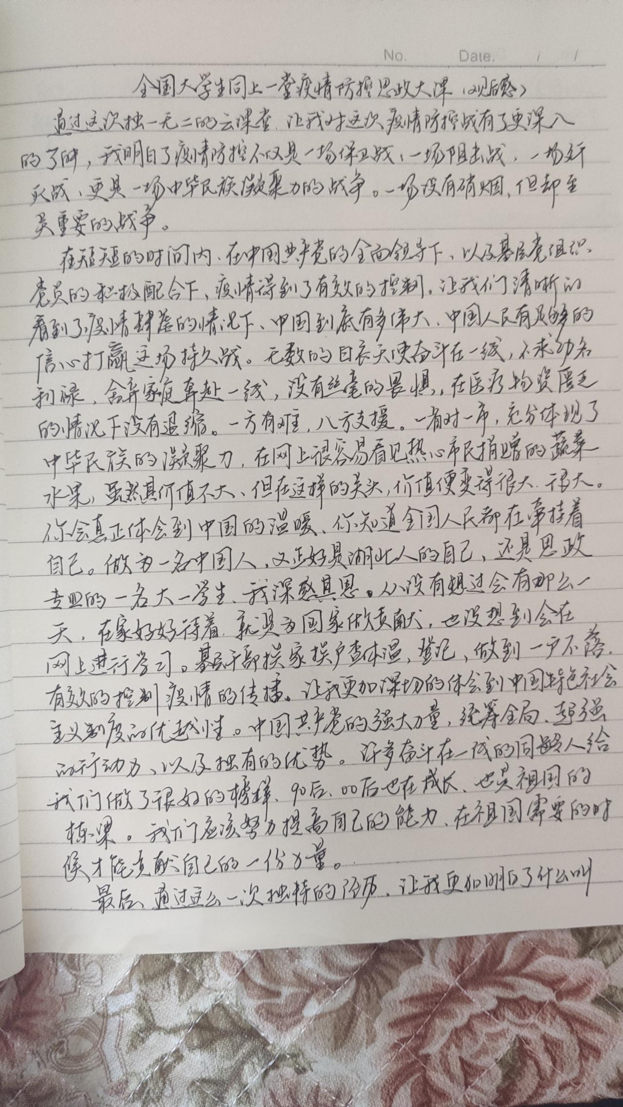 思政11801班班长李懿宸同学感悟:“在这个特殊时期,疫情防控思政大课让全国的大学生感受到了祖国的期望!作为当代大学生,我们应该保持积极乐观的心态,相信国家一定会渡过难关! ”