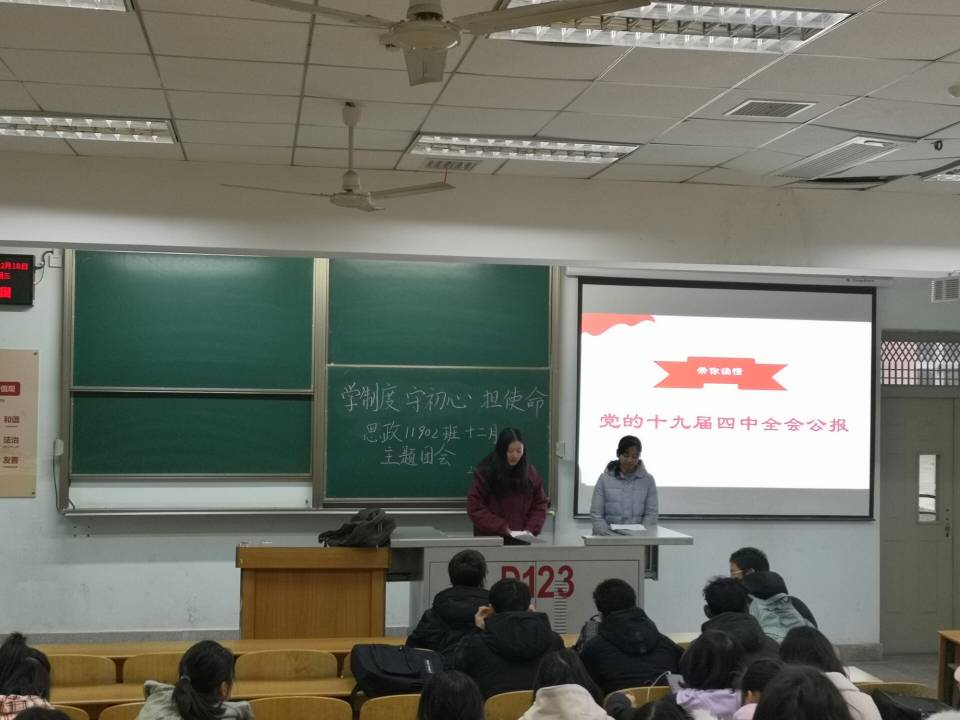 思政11801支部十二月团会主要是在室内开展,通过相关音频分享、主持人对我国现行制度和十九届四中全会的精神的详细讲解,以及相关知识竞答活动和同学代表发言,加深了同学们对我国国情和十九大四中全会精神的了解,坚定了不忘初心跟党走的信念,增强了同学们的时代使命感,取得了良好的效果。思政11802支部这次采用室外学习的方式开展团会,在活跃的气氛中,通过同学宣读十九届四中全会的知识,让每个参与者熟悉时政新闻,另外,由同学发表自己对四中全会精神的理解来引入学制度、守初心、担使命的教育主题活动,通过在活动中对《决定》内容的宣读,增进了对中央政策的理解,既是对当前社会成就的一种总结也是对未来中国社会前进目标的一个认识和强化,坚持中国制度,不忘初心、牢记使命,始终作有担当的中国青年人。