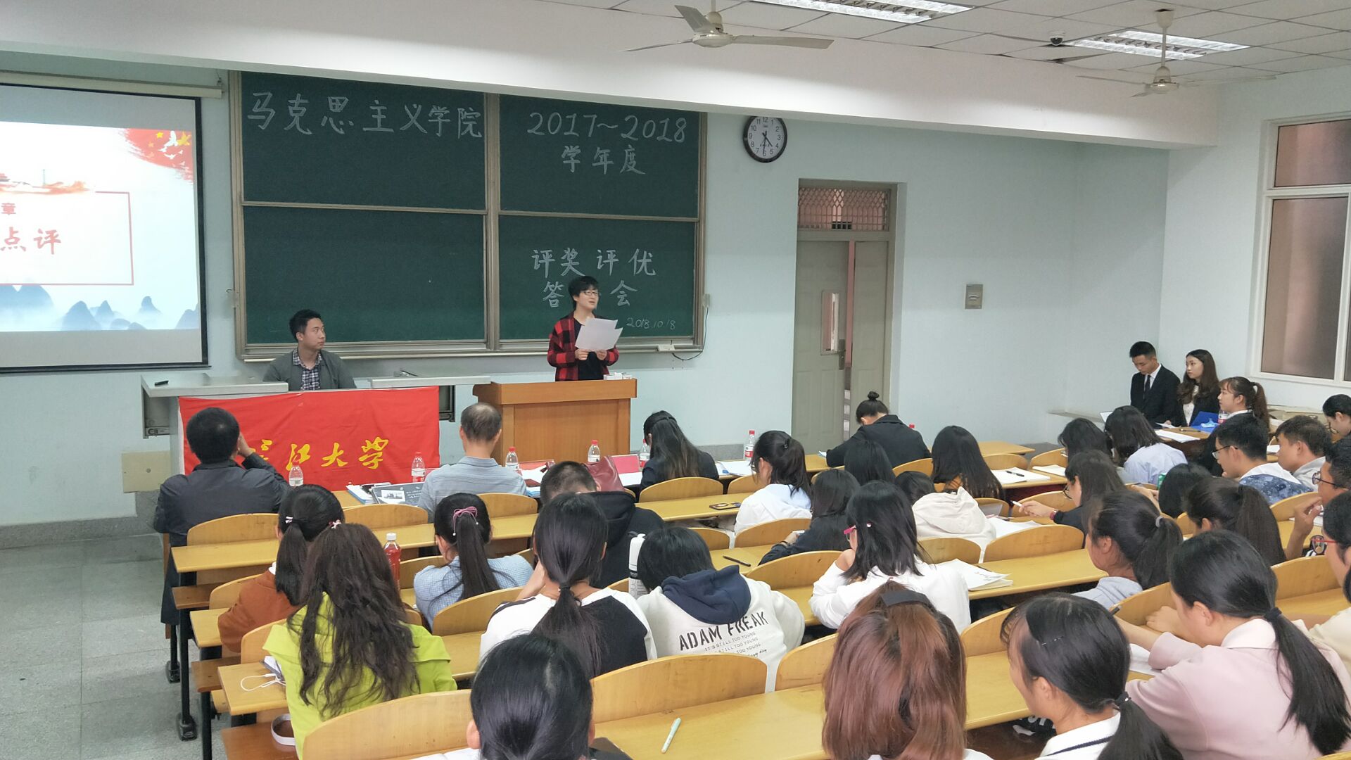 四点三十分,会议圆满结束。本次的会议给了各个优秀班级和优秀个人一个展示自己的平台。同时也为参加了会议的2018级新生树立了一个好的榜样,让新生们以他们为目标,努力学习,积极参与学生活动。