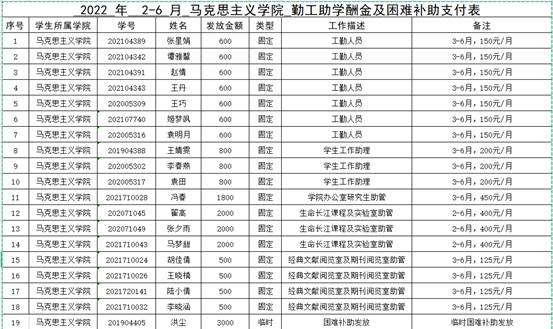 因工作需要和家庭经济困难情况,经学生本人申请,学院审核,现将我院2021-2022学年第二学期勤工助学酬金及困难补助发放情况公示如下: