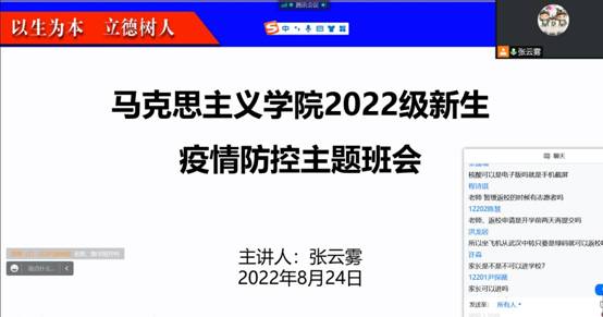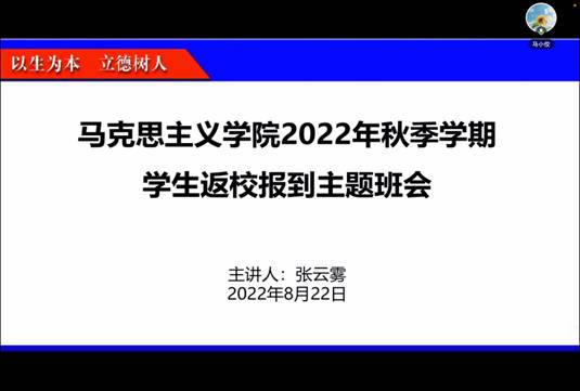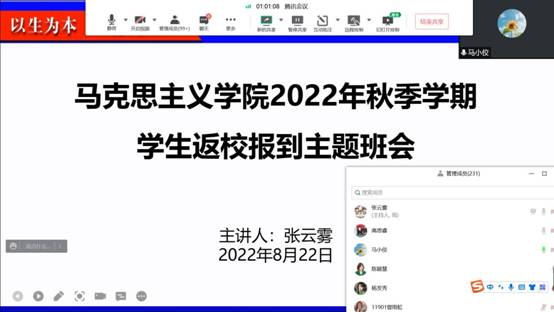 (通讯员:齐晓杭 摄影:龙薛西)为有序做好秋季返校报到工作,讲清疫情防控政策,3044永利2022年秋季学期学生返校报到主题班会于8月22日-8月25日通过腾讯会议线上召开,辅导员张云雾老师、李敏老师分别面向本、研学生进行了宣讲,学院党委副书记马小佼线上参会。